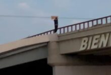 Daba los buenos días en lo alto del puente Las Torres en Pachuca