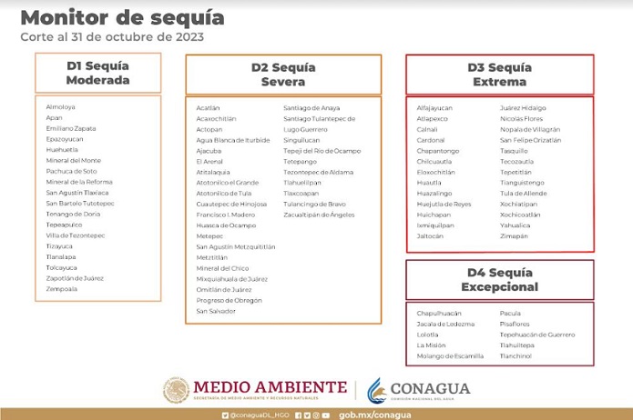 PACHUCA DE SOTO, 08 NOV/NEWS HIDALGO/.- De acuerdo con el Monitor de Sequía en México, a través de la Dirección Local Hidalgo de la Comisión Nacional del Agua (Conagua), con corte al 31 de octubre de 2023, se informa que 10 municipios reportan sequía excepcional (D4), 26 sequía extrema (D3), 30 sequía severa (D2) y 18 con sequía moderada (D1), como se enlista a continuación: