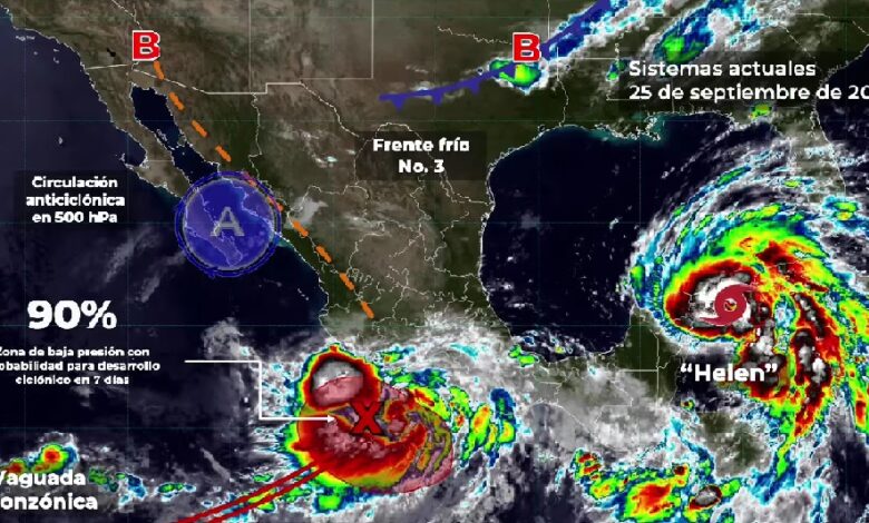 PACHUCA DE SOTO, 25 SEP/NEWS HIDALGO/.- Hoy, una zona baja presión con probabilidad de desarrollo ciclónico ubicada frente a la costa limítrofe de Guerrero y Michoacán, los remanentes de John y la vaguada