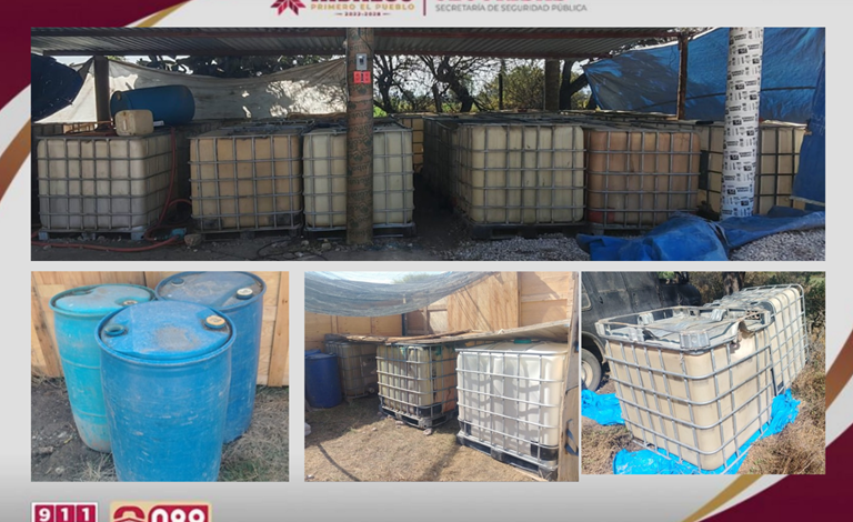 Durante la intervención, las autoridades localizaron 12 contenedores tipo muela abastecidos con 9 mil litros de hidrocarburo, así como 36 contenedores del mismo tipo vacíos y cinco tambos con capacidad de 200 litros, presuntamente utilizados para el resguardo y manejo del combustible de procedencia ilícita.