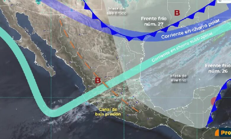 Los efectos antes mencionados serán ocasionados por el frente frío número 27, que será impulsado por una masa de aire ártico e ingresará a la frontera norte y noreste del país, en interacción con la corriente en chorro polar, así como por el frente número 26, que se extenderá como estacionario sobre el oriente de la Península de Yucatán y su masa de aire frío, la cual modificará sus características térmicas,