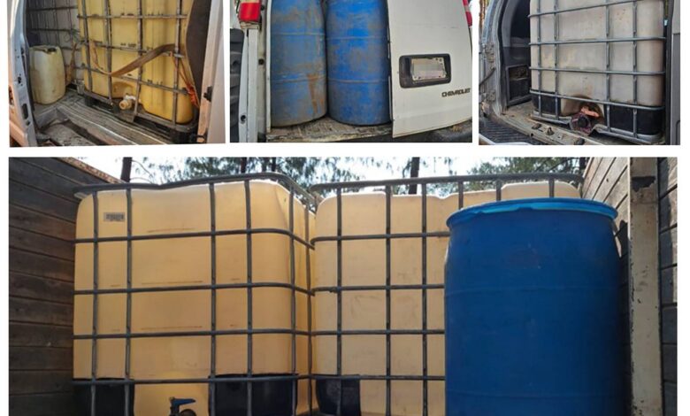 Destaca que al interior de los vehículos se localizaron 28 contenedores con capacidad de mil litros, dos de ellos abastecidos al 25 por ciento con líquido hidrocarburo, un garrafón de 50 litros y 14 tambos de 200 litros vacíos, por lo que se presume fueron usados para el almacenamiento y trasiego ilegal de combustible en la región.