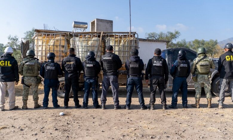 Durante la intervención, los cuerpos de seguridad localizaron un total de 93 dosis de hierba verde con características propias de la marihuana, así como 43 dosis de sustancia cristalina con características del cristal. Además, en el sitio fue asegurada una camioneta con reporte de robo, junto con 15 contenedores plásticos de distintos tipos que en conjunto almacenaban 5 mil 170 litros de hidrocarburo.