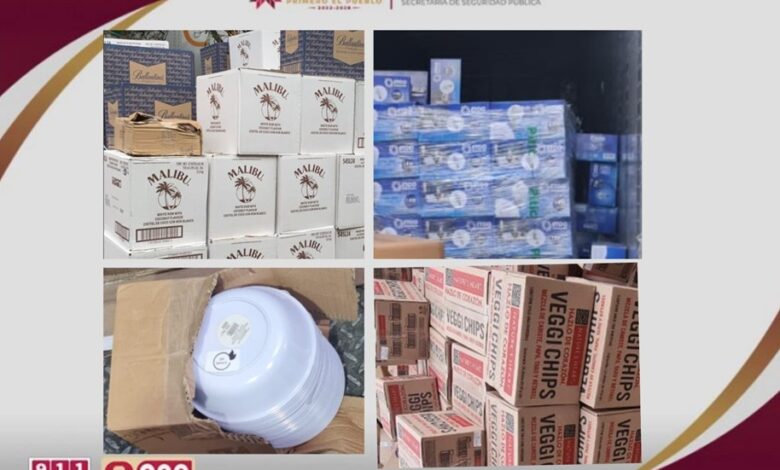 Entre los artículos asegurados se encontraron cajas de fruta seca deshidratada, medicamentos, vajillas, cremas corporales, botellas de licor, platos de unicel, guantes de látex, focos de 7 watts, cosméticos, tubos de cobre, contenedores de alimento para camarón, así como diversas cajas de dulces, los cuales quedaron a disposición de la autoridad competente para las investigaciones correspondientes.