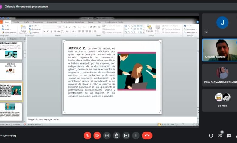 A través de la plataforma virtual de Google Meet, el especialista dio a conocer la Definición de violencia, los artículos que respaldan jurídicamente a quienes viven violencia de género, así como qué es el hostigamiento y acoso sexual; de igual manera, dio a conocer las dependencias y organismos a dónde acudir, en caso de vivir cualquier tipo de violencia, ya sea física, psicológica, económica, emocional o sexual, tanto en el ámbito escolar, familiar o laboral.