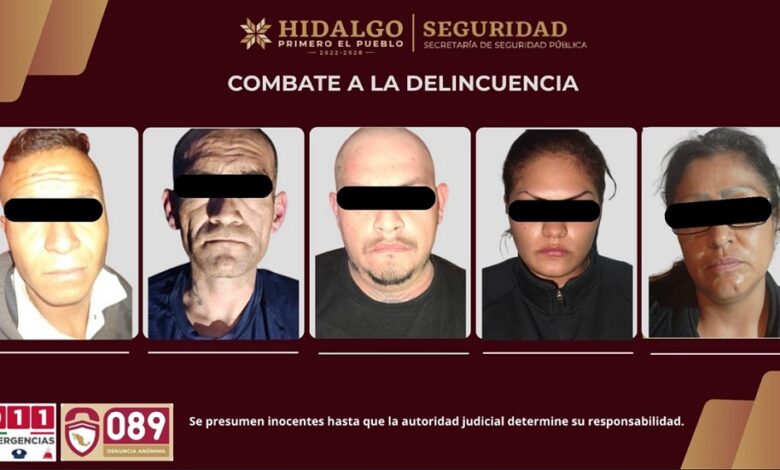 A partir de trabajos de inteligencia de la SSPH, se desarrollaron acciones de manera simultánea en las colonias Jorge Rojo Lugo y La Palma, donde personal estatal aseguró a tres hombres y dos mujeres, cuatro de ellos originarios de otros estados. De acuerdo con las indagatorias, todas las personas involucradas cuentan con antecedentes delincuenciales.