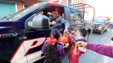 Policías entregan «Calaveritas» a niñas y niños en el centro de Pachuca