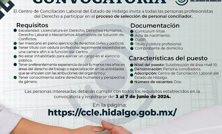 PACHUCA DE SOTO, 04 JUN/NEWS HIDALGO/.- El Centro de Conciliación Laboral del Estado de Hidalgo (CCLEH) difunde su segunda convocatoria pública y abierta 2024 para el proceso de selección del personal conciliador del organismo; informó la directora general del organismo Mariela Valero Mota.