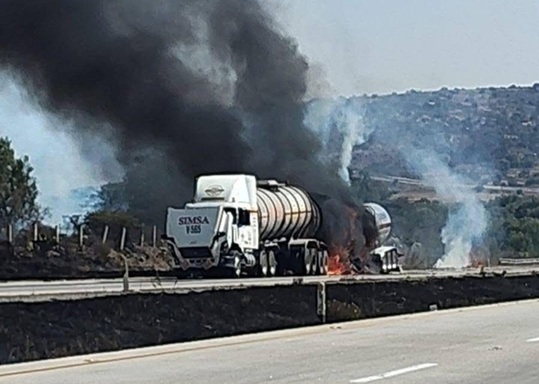 En este sitio colisionaron dos tracto camiones uno de ellos tipo pipa con doble remolque. El que impacto al otro se incendio en el lugar lo que provocó el cierre de la vía de comunicación.