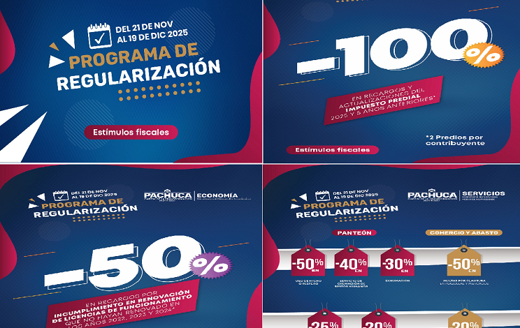 PACHUCA DE SOTO, 14 DIC/NEWS HIDALGO/.- El Ayuntamiento de Pachuca mantiene vigente la etapa final del Programa de Regularización 2025, que estará disponible hasta el 19 de diciembre, con estímulos dirigidos a personas contribuyentes, comerciantes y propietarios.