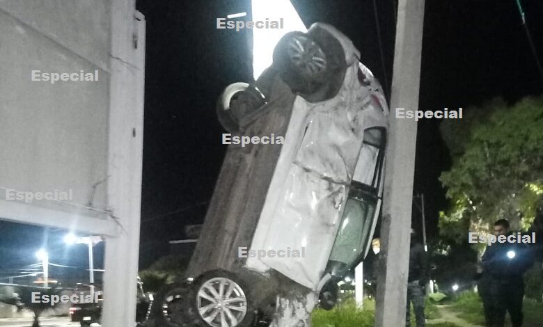 PACHUCA DE SOTO, 26 AGO /NEWS HIDALGO/.- Recargado en posición vertical sobre un poste de energía eléctrica quedo un vehículo particular que se accidentó en la carretera Pachuca – Ciudad Sahagún, a la entrada de esta ciudad industrial.