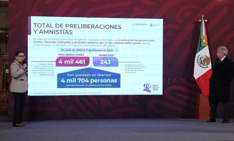 CIUDAD DE MÉXICO, 07 FEB /NEWS HIDALGO/.- De julio de 2022 al 3 de febrero de este año, 4 mil 704 mujeres, adultos mayores, indígenas, enfermos terminales y víctimas de tortura fueron preliberados o recibieron amnistía.