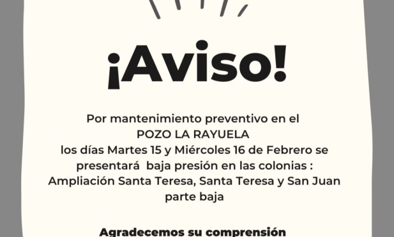 Estas acciones tendrán verificativo este martes 15 y miércoles 16, del presente mes, por lo que se presentará una baja presión en el suministro de agua potable en las colonias: Ampliación Santa Teresa, Santa Teresa y San Juan, en su parte baja.