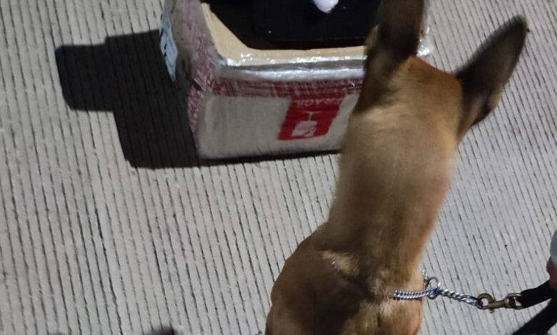 Los hechos se registraron en una empresa de paquetería y mensajería ubicada en la ciudad de Culiacán, donde guardias nacionales con apoyo de un binomio canino, previa autorización, realizaron rastreos preventivos en busca de sustancias u objetos ilícitos.