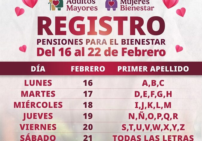 Del 16 al 22 de febrero el registro a las Pensiones Mujeres Bienestar y Adultos Mayores