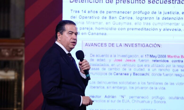 Mejía Berdeja informó que después de 14 años de permanecer prófugo, en la colonia Miramar, en Guaymas, Sonora, fue aprehendido Héctor Adrián “N”, alias “El Tabaco”, quien tiene una orden de aprehensión por los delitos de secuestro de una pareja, homicidio y asociación delictuosa, hechos ocurridos en mayo de 2008, en Cananea.