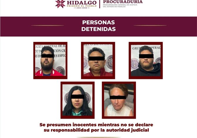 En las acciones a cargo de la Agencia de Investigación Criminal de la PGJEH que se llevaron a cabo la madrugada de este miércoles 04 de marzo de 2026, en el Fraccionamiento Explanada Sur, de Pachuca de Soto, resultaron detenidos M. L. M. E., E. D. R. M., R. Y. R. M., A. G. E., y R. E. R. G., este último empleado de Pemex.