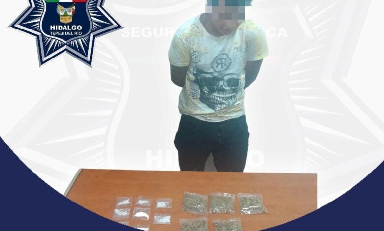 TEPEJI DEL RÍO, 09 JUN /NEWS HIDALGO/.- Elementos de Seguridad Pública Municipal de Tepeji realizaron el aseguramiento de un hombre originario de Sinaloa que al ser intervenido por presentar una actitud sospechosa, le fueron localizados en su posesión sobres con hierba verde con características de la marihuana y sobres con polvo blanco posiblemente de una sustancia ilícita, por lo que fue puesto a disposición de la autoridad competente.