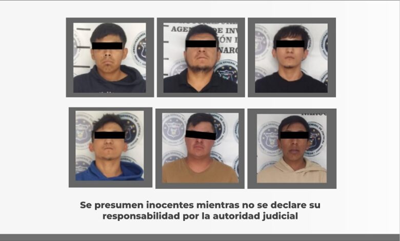 De dicha técnica de investigación resultaron detenidas seis personas de sexo masculino identificadas con iniciales O. G. M., J. R. S. O., I. M. M., E. G. M. M., J. M. G., y D. M. G., quienes serán puestas a disposición de un juez de control del fuero común, autoridad ante la que la que se les formulará imputación y se solicitará su vinculación