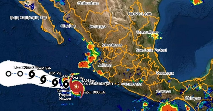 A las 07:00 horas, tiempo del centro de México, el centro de la tormenta tropical Newton se localizó al suroeste de las costas de Jalisco, aproximadamente a 380 km al oeste-suroeste de Playa Pérula, Jalisco y a 590 km al sur-sureste de Cabo San Lucas, Baja California Sur; presentó vientos máximos sostenidos de 95 km/h, rachas de 110 km/h y se desplaza hacia el oeste-noroeste a 15 km/h. Su circulación refuerza la probabilidad de lluvias muy fuertes en Colima y Jalisco, y se aleja de las costas del occidente de México.