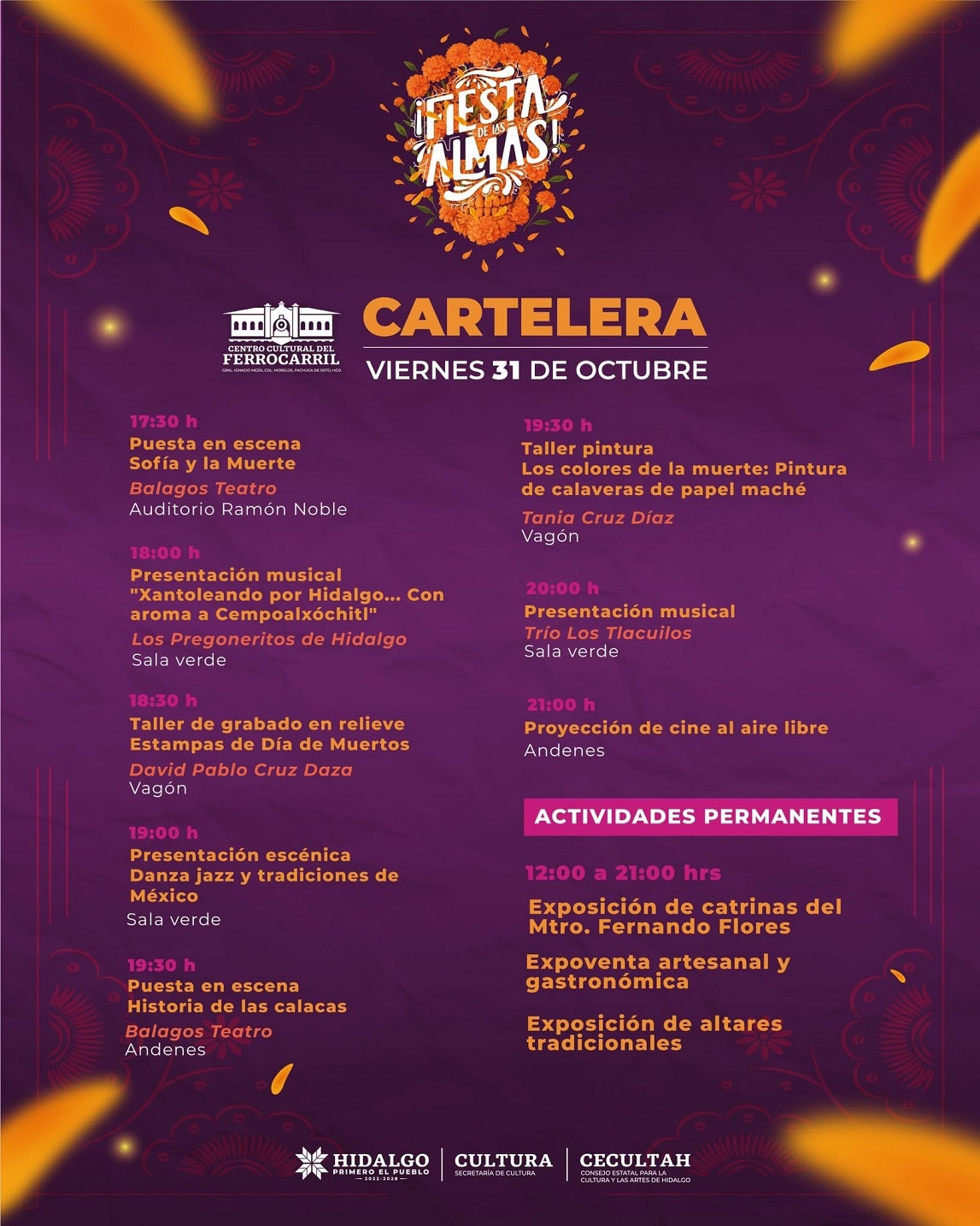 PACHUCA DE SOTO, 28 OCT /NEWS HIDALGO/.- Con motivo de la celebración del Día de Muertos, el Centro Cultural del Ferrocarril abrirá sus puertas este 31 de octubre para conmemorar la Fiesta de las Almas 2025, un encuentro donde el arte, la memoria y la tradición cobrarán vida a través de actividades para toda la familia.