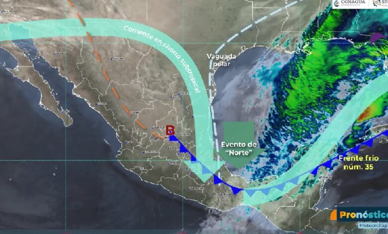 Las condiciones mencionadas las ocasionará el frente frío número 35 extendido sobre la Península de Yucatán, el sureste y oriente de México; su masa de aire ártico; una vaguada polar, y el arrastre de humedad que genera la corriente en chorro subtropical.