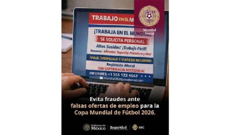 CIUDAD DE MEXICO, 25 ABR/NEWS HIDALGO/.- La Secretaría de Seguridad y Protección Ciudadana (SSPC), a través de la Unidad de Inteligencia, Investigación Cibernética y Operaciones Tecnológicas, y la Policía Cibernética de la Secretaría de Seguridad Ciudadana (SSC) de la Ciudad de México emiten recomendaciones para evitar ser víctimas de falsas vacantes de empleo durante la Copa Mundial de Fútbol 2026.