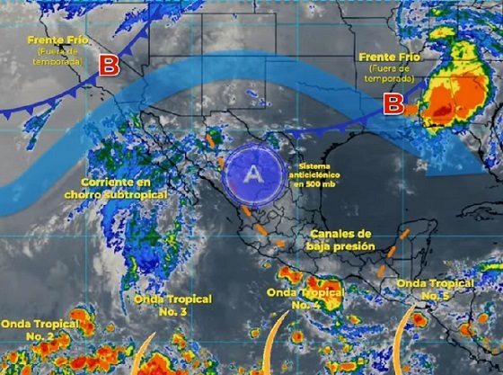 Un canal de baja presión sobre el occidente de México, la entrada de humedad del Océano Pacífico y el desplazamiento de las ondas tropicales número 4 y 5 por el sur de Guerrero y Chiapas, respectivamente, podrían ocasionar lluvias muy fuertes (de 50 a 75 milímetros [mm]) en Chiapas y Oaxaca; fuertes de (25 a 50 mm) en Guerrero; chubascos (de 5 a 25 mm) en Chihuahua, Coahuila, Durango, Jalisco, Michoacán y el sur de Veracruz, y lluvias aisladas (de 0.1 a 5 mm) en Campeche, Colima, Estado de México, Quintana Roo y Tabasco.