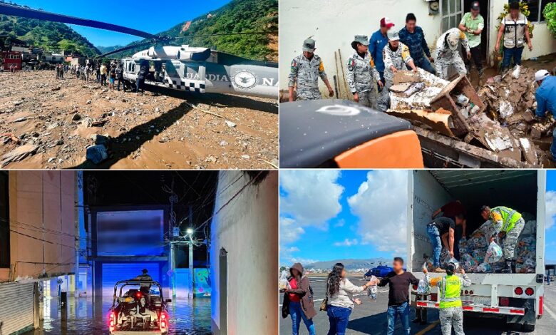 En coordinación autoridades de los tres órdenes de Gobierno, la Guardia Nacional realiza recorridos para ubicar zonas donde se presentaron inundaciones y ha disminuido el nivel del agua, para ayudar con el retiro de lodo y escombro del interior de las viviendas, así como la recuperación de muebles y enseres domésticos.