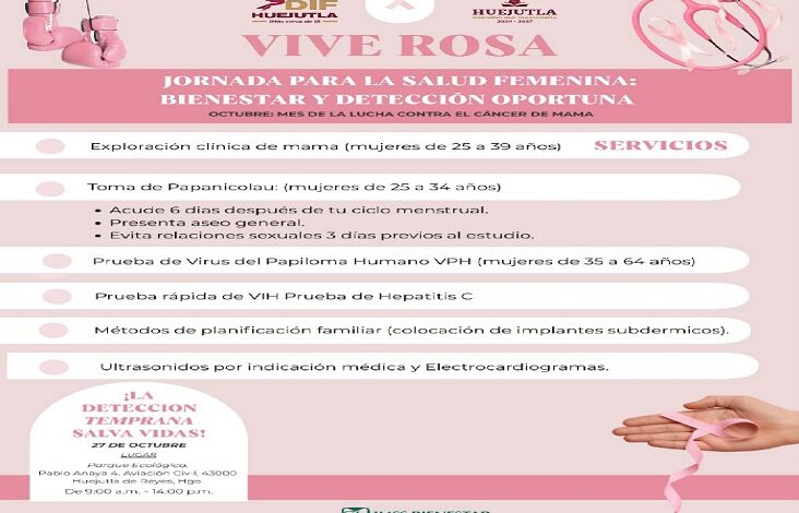 Esta importante actividad se realizará el 27 de octubre, en un horario de 9:00 de la mañana a 2:00 de la tarde, en las instalaciones del Parque Ecológico, donde se espera la participación de mujeres de Huejutla y de la región Huasteca. Durante la jornada se contará con la colaboración de personal médico y de enfermería del Hospital Regional de la Huasteca, el Hospital Integral de Atlapexco y el Hospital Ilusión de Tlanchinol.
