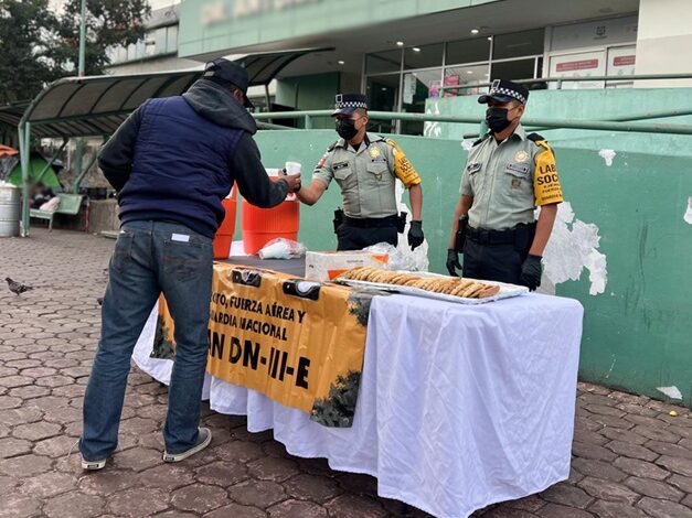 El personal de esta fuerza de seguridad pública acude a zona de hospitales en el municipio de Tepic, Nayarit, donde instalan módulos de distribución de bebidas calientes y alimentos para mitigar el frío.