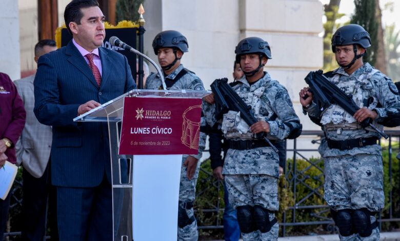 Acompañado del inspector Eduardo García Grajeda representante del Comisario José Efraín Amancio González Zea,  coordinador de la Guardia Nacional (GN) en Hidalgo,  el funcionario reconoció que los ideales revolucionarios perduran en la búsqueda constante del país que merecemos.