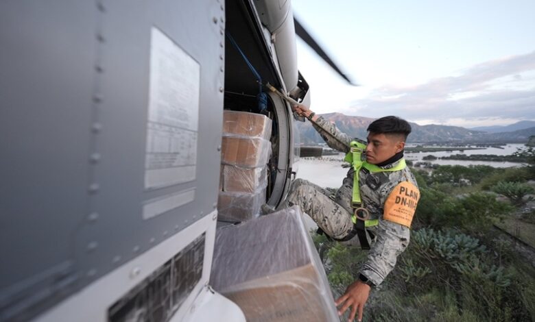 En la Vega de Metztitlán, los oficiales de descarga se anclan con un arnés para salir del helicóptero y soltar los víveres y sin poner en riesgo a la población que las recibe.