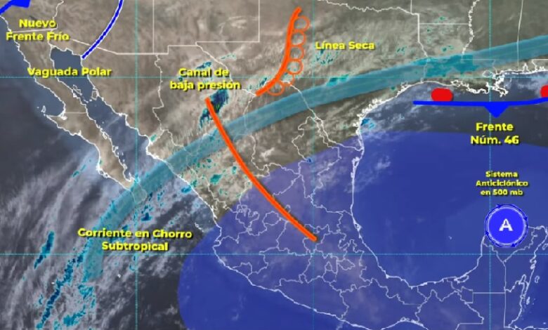Para el Pacífico Norte se estima cielo medio nublado, ambiente fresco durante la mañana, frío en zonas serranas de Sonora, de cálido a caluroso por la tarde en la región, viento de componente oeste de 10 a 25 km/h y rachas de 40 a 60 km/h en Sonora.