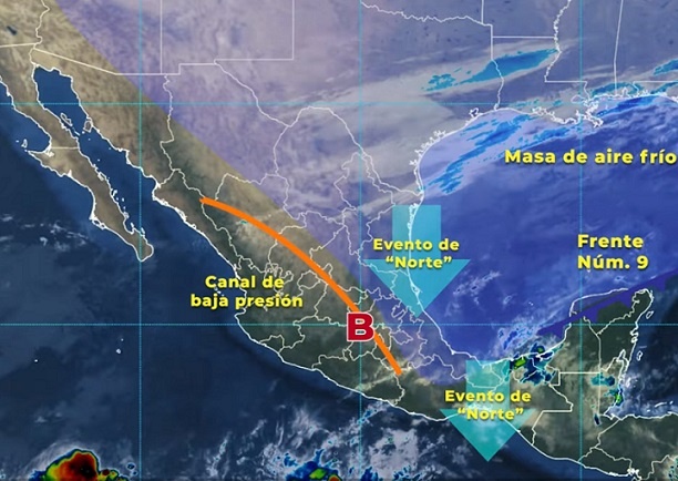 El sistema frontal número 9, que se extenderá con características de estacionario desde el oriente del Golfo de México hasta el sur de Veracruz, en interacción con un canal de baja presión en el sureste del país, la masa de aire frío asociada al sistema, la cual será reforzada por una nueva masa de aire frío, y el ingreso de humedad del Océano Pacífico y Golfo de México, son los sistemas meteorológicos que generarán los efectos antes mencionados.