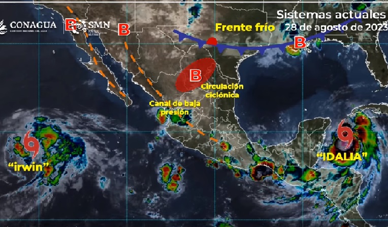 Las precipitaciones mencionadas serán ocasionadas por la abundante entrada de humedad del Golfo de México y Océano Pacífico hacia el interior del país; un canal de baja presión en el occidente y centro del país, en combinación con el monzón mexicano; un sistema frontal fuera de temporada en el norte de México, y por el ciclón tropical Idalia que se localizará frente a las costas de Quintana Roo.