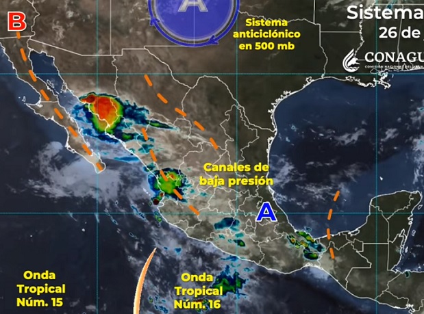 La onda tropical número 16 que se desplazará al suroeste de las costas de Colima y Jalisco, canales de baja presión extendidos al interior del país, inestabilidad en niveles altos de la atmósfera, el monzón mexicano y el ingreso de humedad del Océano Pacífico, Golfo de México y Mar Caribe, serán los sistemas meteorológicos que ocasionen el estado del tiempo mencionado.