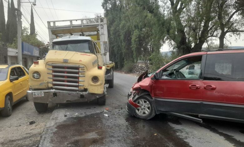 La policía local que se hizo cargo del hecho de tránsito informó que la camioneta Dodge Caravan, color rojo, con matrícula de Hidalgo, se encontraba abandonada luego de impactar contra un camión Dina, tipo torton, color amarillo.