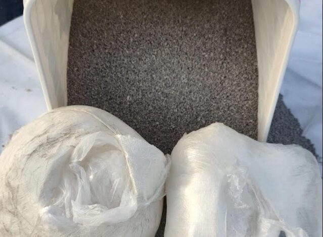Los elementos inspeccionaron el envío procedente de Culiacán, con destino a la Ciudad de México, y se percataron de que transportaba una cubeta con tapa, etiquetada como arena para gato; sin embargo, entre el material compuesto de polvo y gravilla se ocultaban dos paquetes confeccionados con plástico transparente con una sustancia blanca y cristalina, similar al narcótico conocido como metanfetamina, con peso aproximado de dos kilogramos.