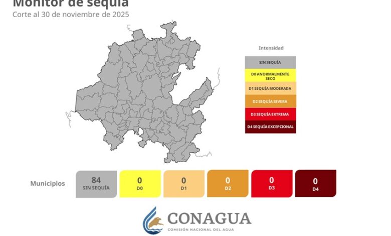 PACHUCA DE SOTO, 08 DIC /NEWS HIDALGO/.- De acuerdo con el Monitor de Sequía en México del Servicio Meteorológico Nacional (SMN) con corte al 30 de noviembre de 2025, la Comisión Nacional del Agua (Conagua), a través de su Dirección Local Hidalgo, informa que los 84 municipios que conforman el territorio hidalguense se encuentran libres de sequía.