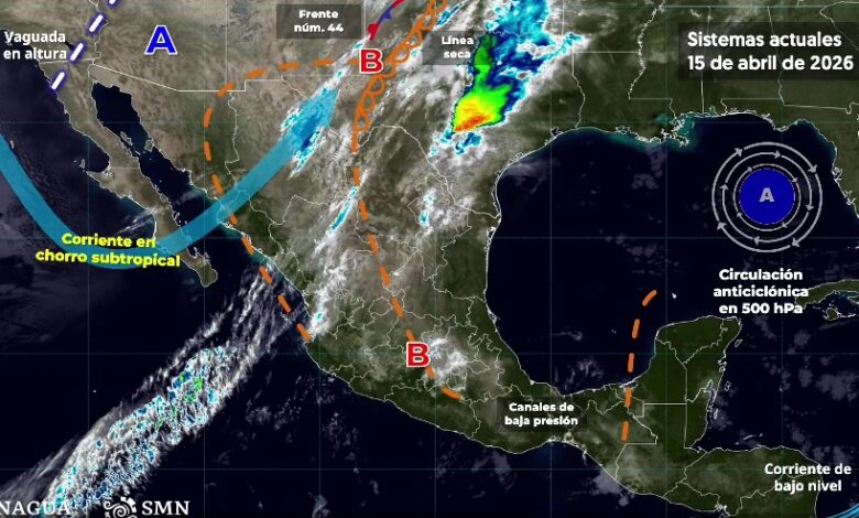 PACHUCA DE SOTO, 15 ABR/NEWS HIDALGO/.- Este día, una línea seca prevalecerá en el norte del territorio nacional, en interacción con el frente núm. 44, que se extenderá cerca de la frontera norte de México, con una vaguada en altura y con la corriente en chorro subtropical, ocasionarán intervalos de chubascos en Coahuila, Nuevo León, Tamaulipas y San Luis Potosí; además de lluvias aisladas en Chihuahua y Zacatecas; dichas lluvias podrían estar acompañadas con descargas eléctricas y caída de granizo. Así mismo, se prevén rachas de viento de 50 a 70 km/h en Chihuahua y Durango; y con posible formación de torbellinos en Coahuila (norte), Nuevo León (norte) y Tamaulipas (noroeste). Por otra parte, canales de baja presión en el interior y sureste de la República Mexicana, aunados al ingreso de humedad del océano Pacífico, golfo de México y mar Caribe, generarán lluvias y chubascos con descargas eléctricas en estados del occidente, centro, sur y sureste del territorio mexicano, incluida la península de Yucatán. Finalmente, se mantendrá la onda de calor en Sinaloa (norte, centro y sur), Nayarit (norte y sur), Jalisco (oeste y sur), Colima (este y sur), Michoacán (centro y oeste), Guerrero (noroeste, este y sur), Morelos (sur), Puebla (suroeste) y Oaxaca (sur).