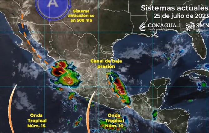 Las condiciones meteorológicas antes descritas serán ocasionadas por la onda tropical número 16, que recorrerá el occidente del territorio nacional, en interacción con el ingreso de aire húmedo procedente de ambos litorales, el monzón mexicano, y un canal de baja presión en el sureste del país.