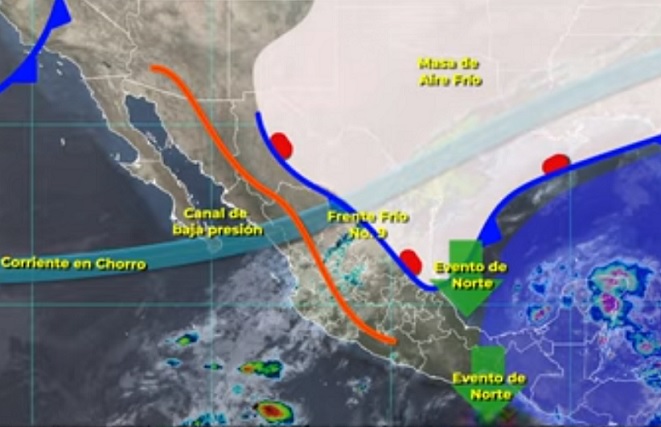El frente número 9, que se extenderá con características de estacionario desde el norte del Golfo de México hasta el norte de Veracruz, su masa de aire frío, así como canales de baja presión extendidos en diversas regiones del país; el ingreso de humedad proveniente del Océano Pacífico y Mar Caribe, y las corrientes en chorro subtropical y polar, son los sistemas meteorológicos que generarán el estado del tiempo mencionado.