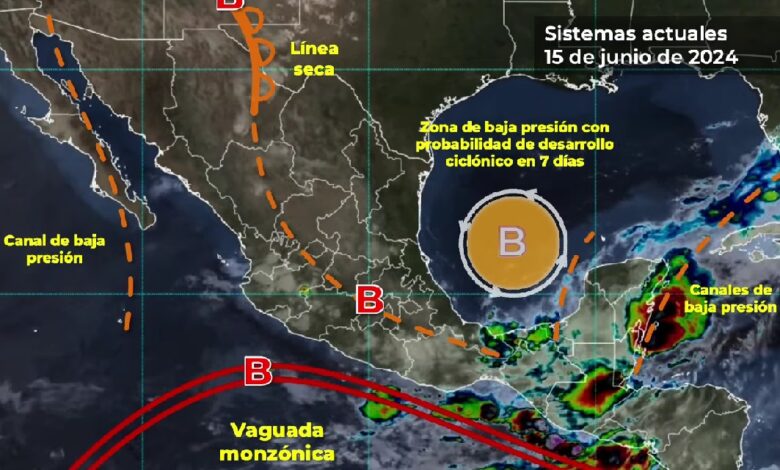 PACHUCA DE SOTO, 15 JUN/NEWS HIDALGO/.- Hoy, se espera que un temporal de lluvias ocasionado por un canal de baja presión sobre el sureste de México y la Península de Yucatán, así como por la vaguada monzónica frente a las costas del Pacífico Sur mexicano y una zona de baja presión con probabilidad de desarrollo ciclónico en el sur del Golfo de México, originen lluvias puntuales torrenciales (de 150 a 250 milímetros [mm]) en zonas de Chiapas, Oaxaca y Tabasco; intensas (de 75 a 150 mm) en Campeche, Quintana Roo, Veracruz y Yucatán, así como muy fuertes (de 50 a 75 mm) en Guerrero.