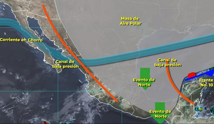 PACHUCA DE SOTO, 21 NOV/NEWS HIDALGO/.- Hoy, el sistema frontal número 10 en el oriente del Golfo de México, su masa de aire frío asociada y canales de baja presión sobre el sureste y el interior del país ocasionarán lluvias intensas (de 75 a 150 milímetros [mm]) en Chiapas, Tabasco, el oriente de Oaxaca y el sur de Veracruz; muy fuertes (de 50 a 75 mm) en Campeche; fuertes (de 25 a 50 mm) en Quintana Roo, Tamaulipas y Yucatán; chubascos (de 5 a 25 mm) en Aguascalientes, Ciudad de México, Estado de México, Guanajuato, Guerrero, Hidalgo, Jalisco, Michoacán, Morelos, Nuevo León, Puebla, Querétaro, San Luis Potosí y Zacatecas, y lluvias aisladas (de 0.1 a 5 mm) en Coahuila, Colima, Durango, Nayarit y Tlaxcala.