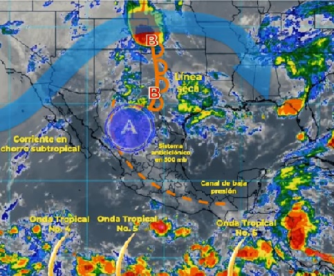 PACHUCA DE SOTO, 22 JUN/NEWS HIDALGO/.- Hoy, una línea seca en el noreste de México, canales de baja presión sobre la Península de Yucatán y el norte, occidente, oriente y sureste del país y la Onda Tropical Número 6 que se desplazará al sur de dicha península, podrían ocasionar lluvias intensas (de 75 a 150 milímetros [mm]) en Chiapas; muy fuertes (de 50 a 75 mm) en Campeche, Oaxaca, Quintana Roo y Tabasco; fuertes (de 25 a 50 mm) en Chihuahua, Durango, Guerrero, Yucatán y el sur de Veracruz; chubascos (de 5 a 25 mm) en Coahuila, Michoacán y San Luis Potosí, y lluvias aisladas (de 0.1 a 5 mm) en Colima, Jalisco, Nuevo León y Zacatecas.