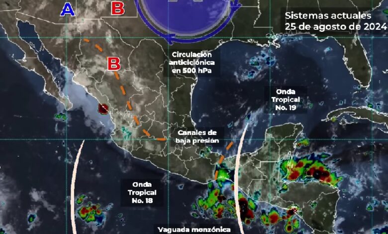 A su vez, el monzón mexicano, otro canal de baja presión sobre el norte y centro de la República Mexicana y el ingreso de humedad de ambos litorales, generarán lluvias muy fuertes en Chihuahua, Durango, Nayarit y Sinaloa; fuertes en Colima, Coahuila, Jalisco, Michoacán, Nuevo León, Sonora y Tamaulipas, así como chubascos (de 5 a 25 mm) en Aguascalientes, Baja California Sur, Guanajuato, Hidalgo, Querétaro, San Luis Potosí y Zacatecas.