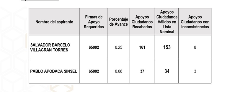 Consecuentemente los CC. Salvador Barceló Villagrán Torres y Pablo Apodaca Sinsel, no podrán solicitar su registro como Candidatos Independientes en el periodo establecido para ello, debido a que no alcanzaron el umbral mínimo requerido.