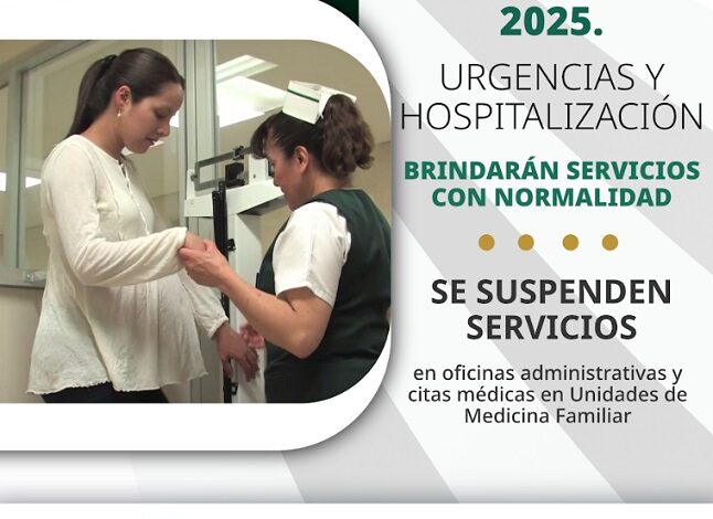 PACHUCA DE SOTO, 25 DIC/NEWS HIDALGO/.- El Instituto Mexicano del Seguro Social (IMSS) en Hidalgo informa a la población derechohabiente que el próximo 25 de diciembre del presente año, los servicios de Urgencias y Atención Médica Continua operarán con normalidad en todas las unidades médicas del estado, a fin de asegurar la atención oportuna ante cualquier eventualidad de salud.