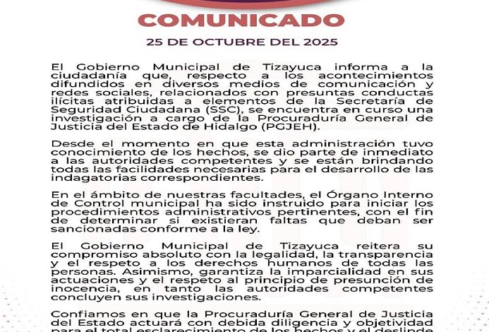 La alcaldía emitió un comunicado en el que lamenta los hechos ocurridos y señala que de forma coordinada con las instancias estatales realizan las investigaciones correspondientes para el esclarecimiento del hecho en el que un detenido resultó lesionado presuntamente por una golpiza que sufrió a manos de los policías que lo detuvieron por una falta administrativa y posterior al salir del área de retención primaria fue ingresado a un hospital donde falleció.